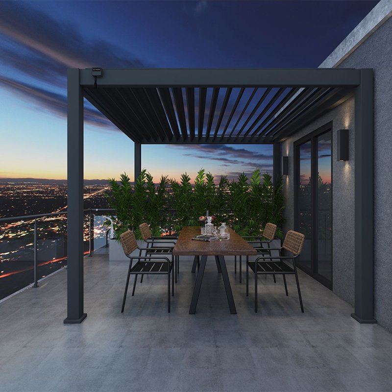 De Novum Orion overkapping onderscheidt zich niet alleen in materiaalkeuze, maar vooral in het unieke ontwerp. Over alles is nagedacht bij deze overkapping. Allereerst worden alle schroeven vanaf de binnenkant gemonteerd en afgedekt met kapjes. Hierdoor ziet u geen schroeven aan de buitenkant. Ten tweede kunnen de gaten in de poten zelf gekozen worden. Hierdoor bepaalt u zelf de waterafvoer en voorkomt u dat uw terras onder water komt te staan. Uiteraard is deze overkapping ook 100% waterdicht. Een andere unieke eigenschap is dat de lamellen volledig achter de ligger blijven als deze omhoog staan. Hierdoor blijven de lamellen uit het zicht.