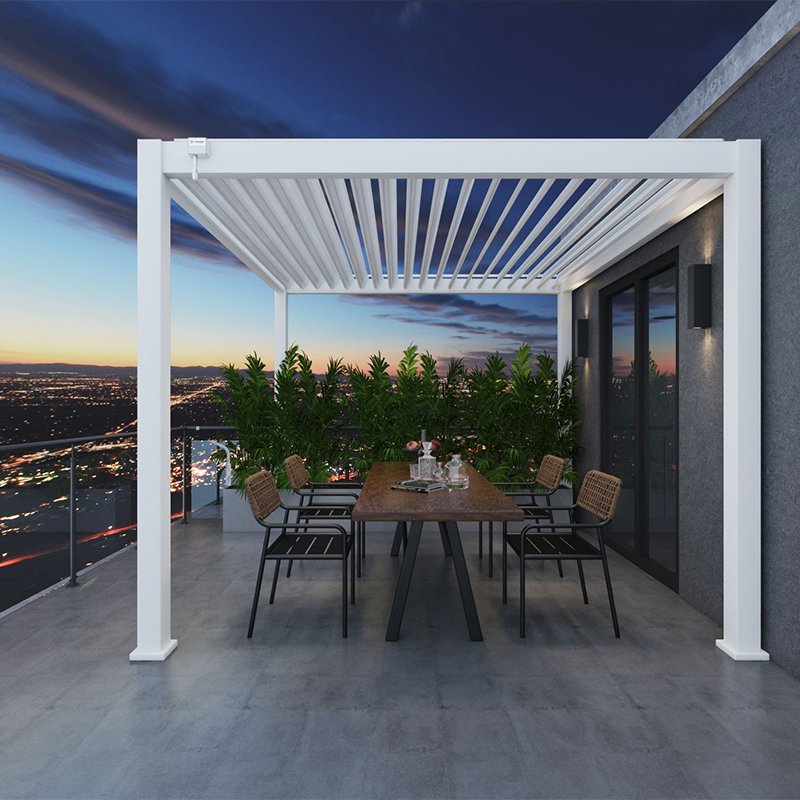 De Novum ORION overkapping onderscheid zich niet alleen in materiaal keuze maar vooral in het unieke ontwerp. Over alles is nagedacht bij deze overkapping. Allereerst worden alle schroeven vanaf de binnenkant gemonteerd en afgedekt met kapjes. Hierdoor zie je geen schroeven aan de buitenkant. Ten tweede kunnen de gaten in de poten zelf gekozen worden. Hierdoor bepaal je de waterafvoer en voorkom je dat je terras onder water komt te staan. Uiteraard is deze overkapping ook 100% waterdicht. Een andere unieke eigenschap is dat de lamellen volledig achter de ligger blijven als deze omhoog staan. Hierdoor blijven de lamellen uit het zicht.