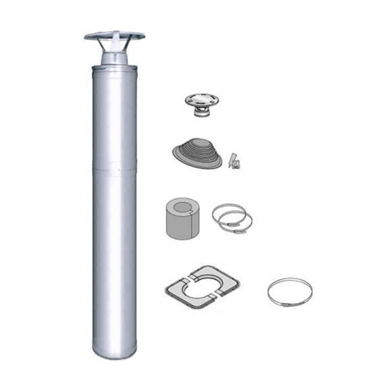De standaard levering van de stalen schoorsteen omvat de stalen schoorsteen en een utilitybox met 1,0 m niet-geïsoleerde rookpijp, een regenkap, een rubberen regenflens en een installatieset voor de regenflens, een roestvrijstalen doorvoerflens voor het plafond en een doorvoerisolatie en beschermer.