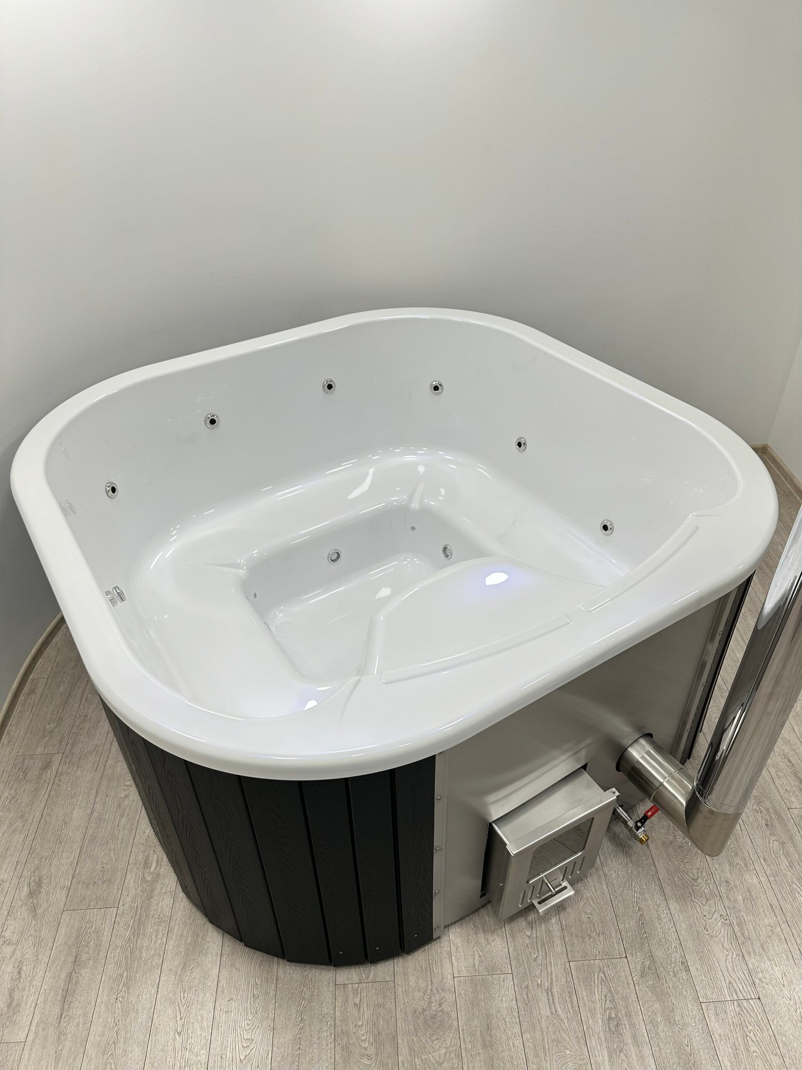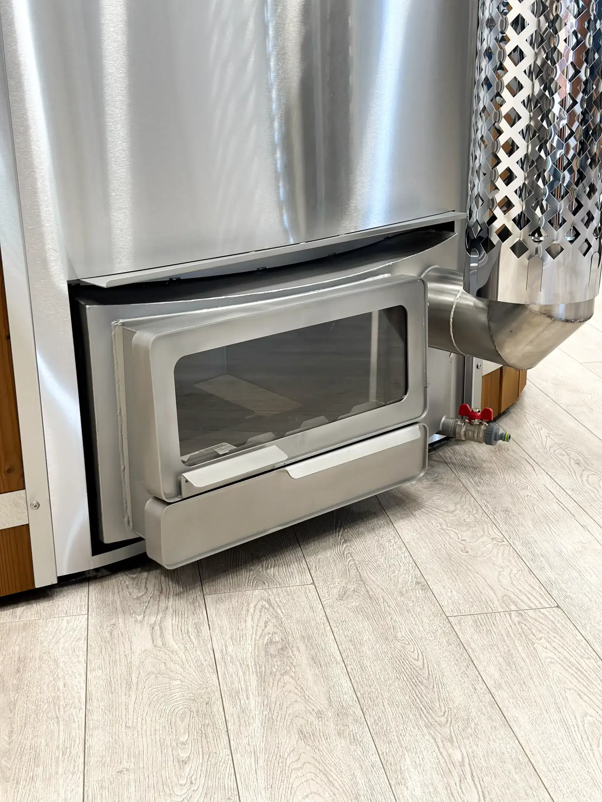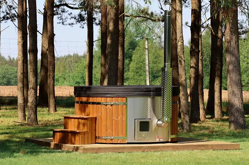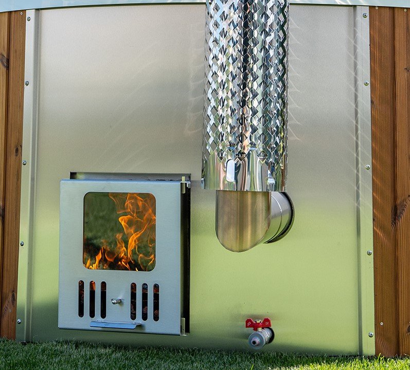 Een hout gestookte kachel zorgt snel voor de gewenste watertemperatuur.